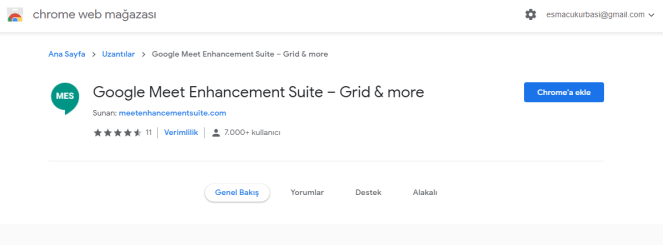 Birincisi “Google Meet Grid View” (1) uzantısı. Bu uzantıya buraya tıklayarak ulaşabilirsiniz. İkincisi ise “Nod – Reactions for Google Meet” (2) uzantısı. Bu uzantıya da buraya tıklayarak ulaşabilirsiniz. Üçüncüsü ise “Google Meet Enhancement Suite – Grid & more” uzantısı. Favori uzantım bu benim. Bu uzantı için ise buraya tıklamanız yeterli.