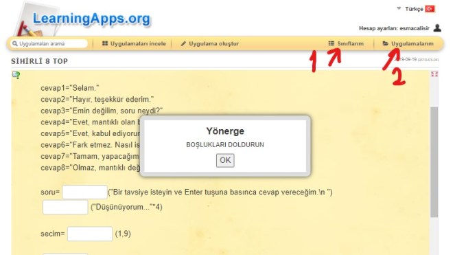 Bu şekilde kullanım ile istediğiniz kadar etkinlik hazırlayabilir ve dilediğiniz tüm kişilerle paylaşabilirsiniz. Ancak öğrencilerinizi takip etmek ve onların yanıtlarını görmek istiyorsanız sınıf oluşturmanız gerekmektedir. Bu işlemde oldukça basit. Aşağıdaki pencere 1 ile gösterdiğim “Sınıflarım” butonuna basınız.