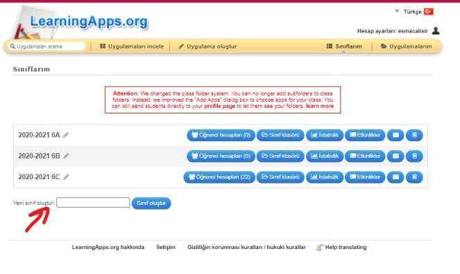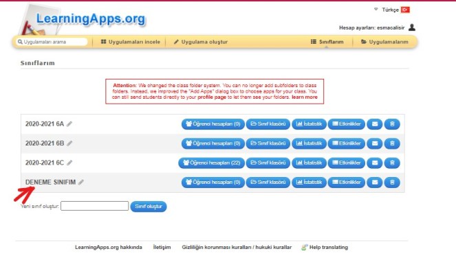 Yeni sınıf oluştur bölümüne sınıf isminizi yazıp sınıf oluştur butonuna bastığınızda sınıfınız oluşuyor. Ben deneme sınıfım isimli bir sınıf oluşturdum şimdi ve aşağıdaki sınıf listeme eklendi. Şimdi aynı satırda yer alan öğrenci hesapları bölümüne tıklayıp, toplu olarak öğrenci listesini ekleyebilirsiniz ve sistemin otomatik sunduğu şifreleri öğrencilere vererek sisteme girişlerini sağlabilir ve sizin onlara atadığınız etkinlikleri uygulamalarını sağlayabilirsiniz.